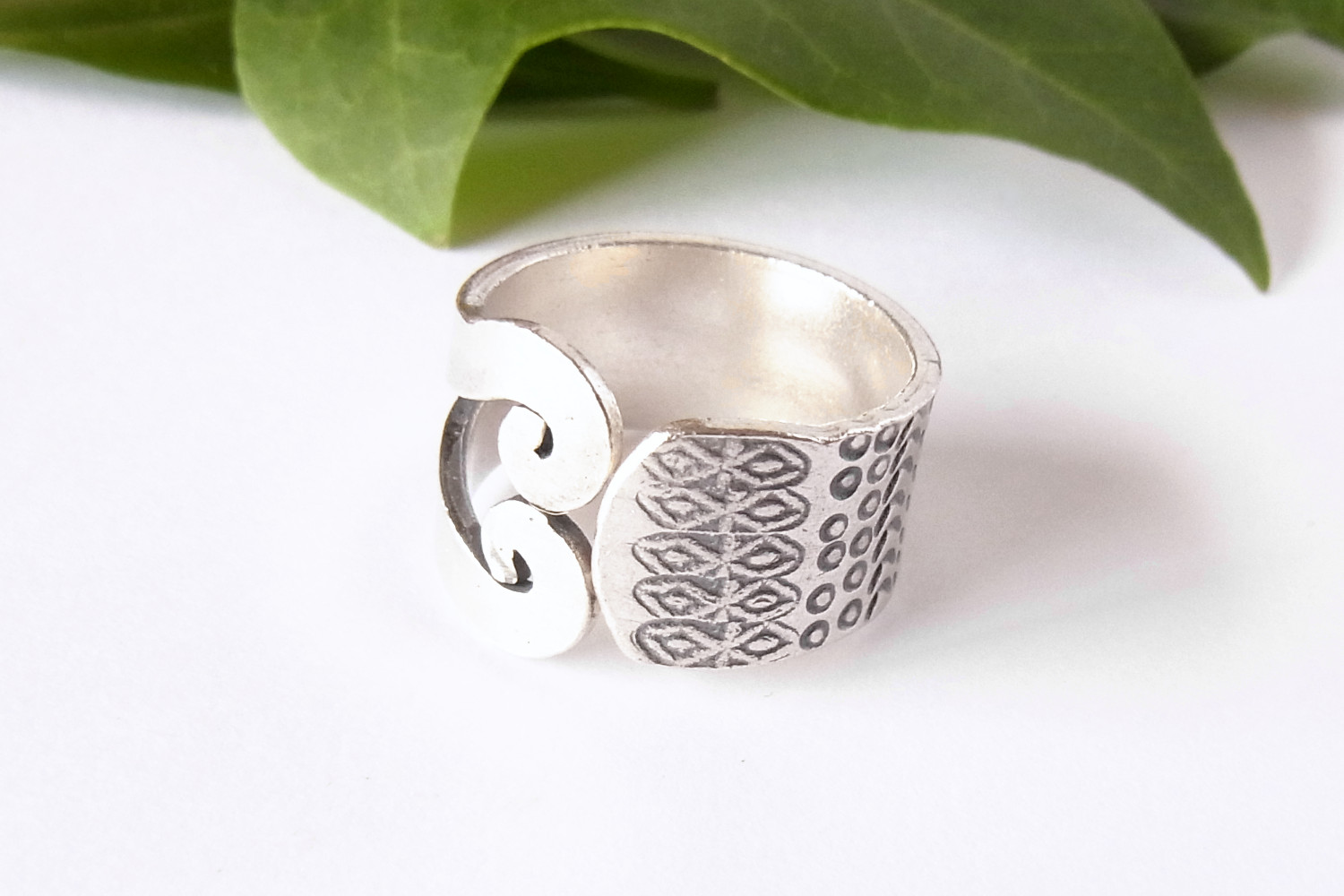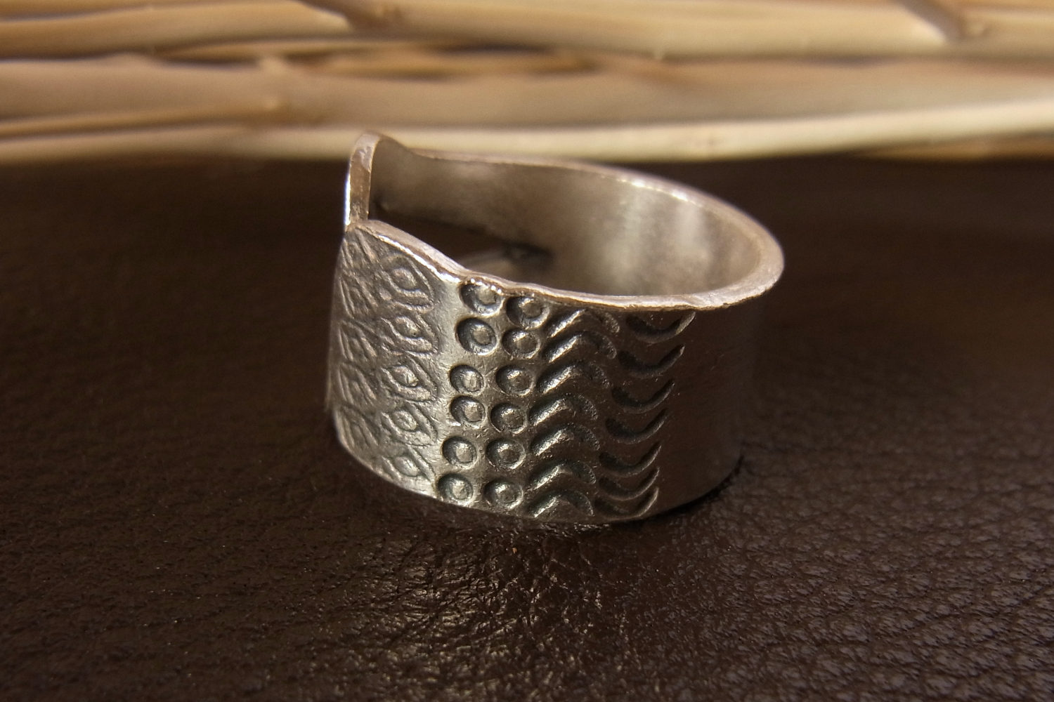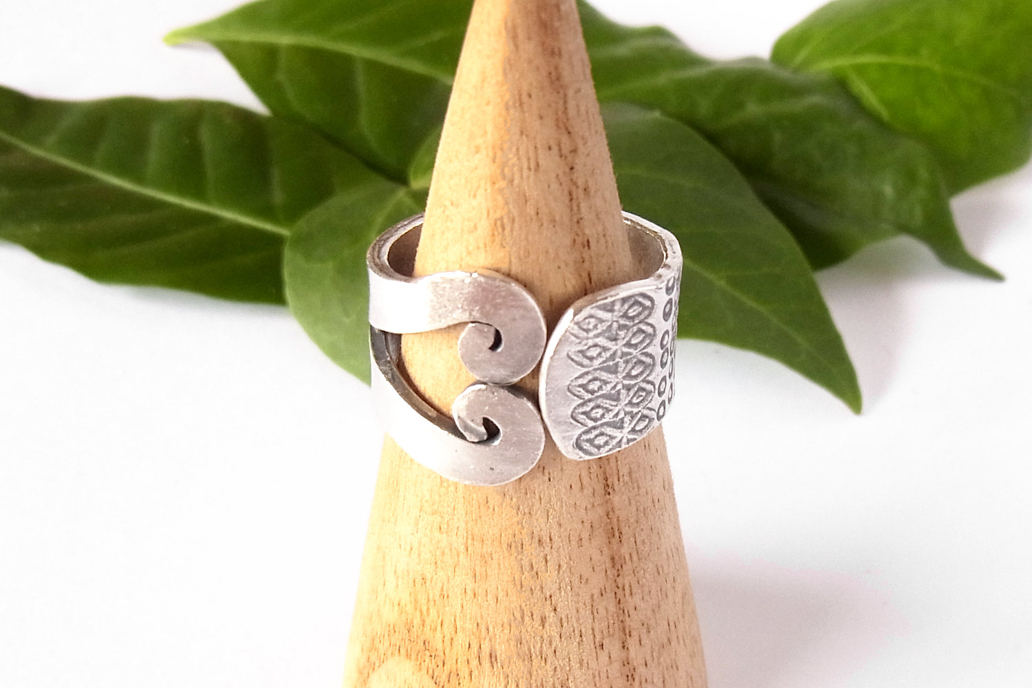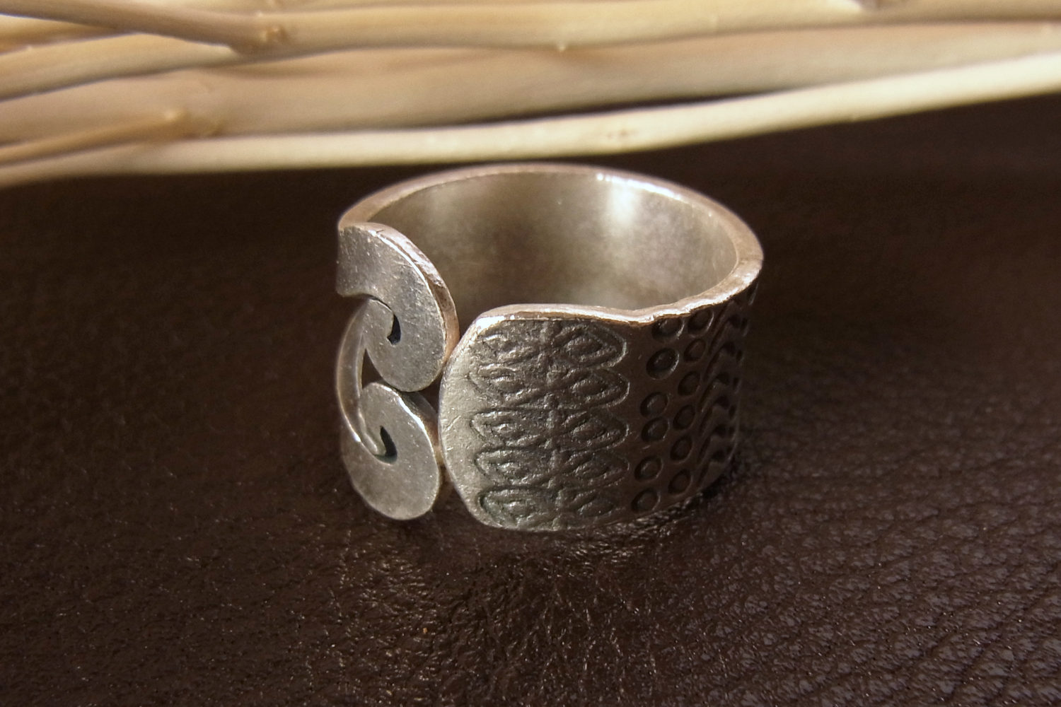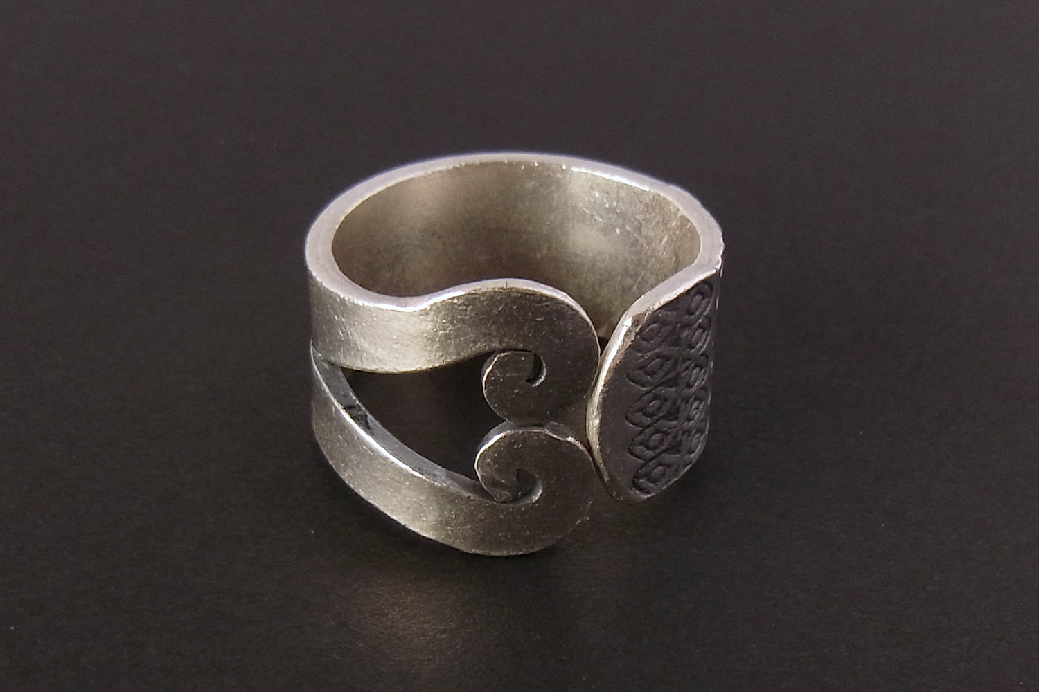 カレン族によってつくり出されるシルバーアクセサリーには、代々受け継がれてきたアニミズムや自然と共存した生活に基づく刻印や造形が多く見られます。こちらのカレン族シルバーリングは、片側は緩やかな渦巻き、もう一方は第三の眼などの刻印が施されたアシンメトリー・デザインとなっております。