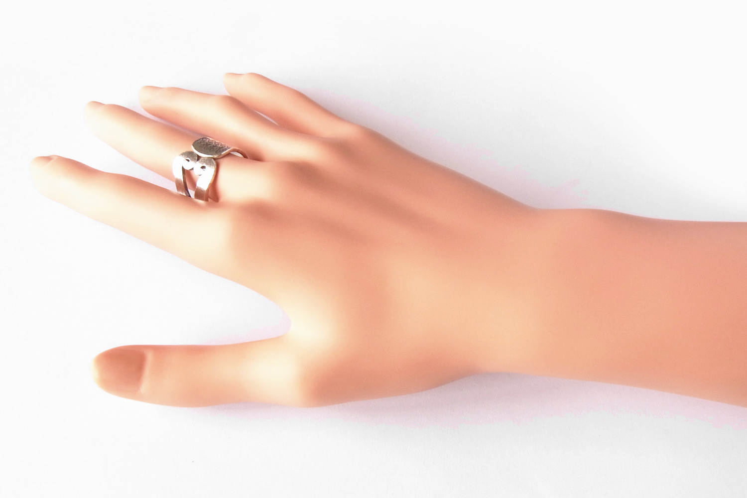 - こちらのシルバーリングはアームの後ろ部分もやや幅広のデザインとなります。通常の細身のリングでのサイズ感よりも少しきつく感じる事がありますので、お手持ちの幅広デザインのリングの号数を参考になさるか、身に着けていらっしゃる細身のリングよりもやや大きめの号数を目安にされてみて下さい。