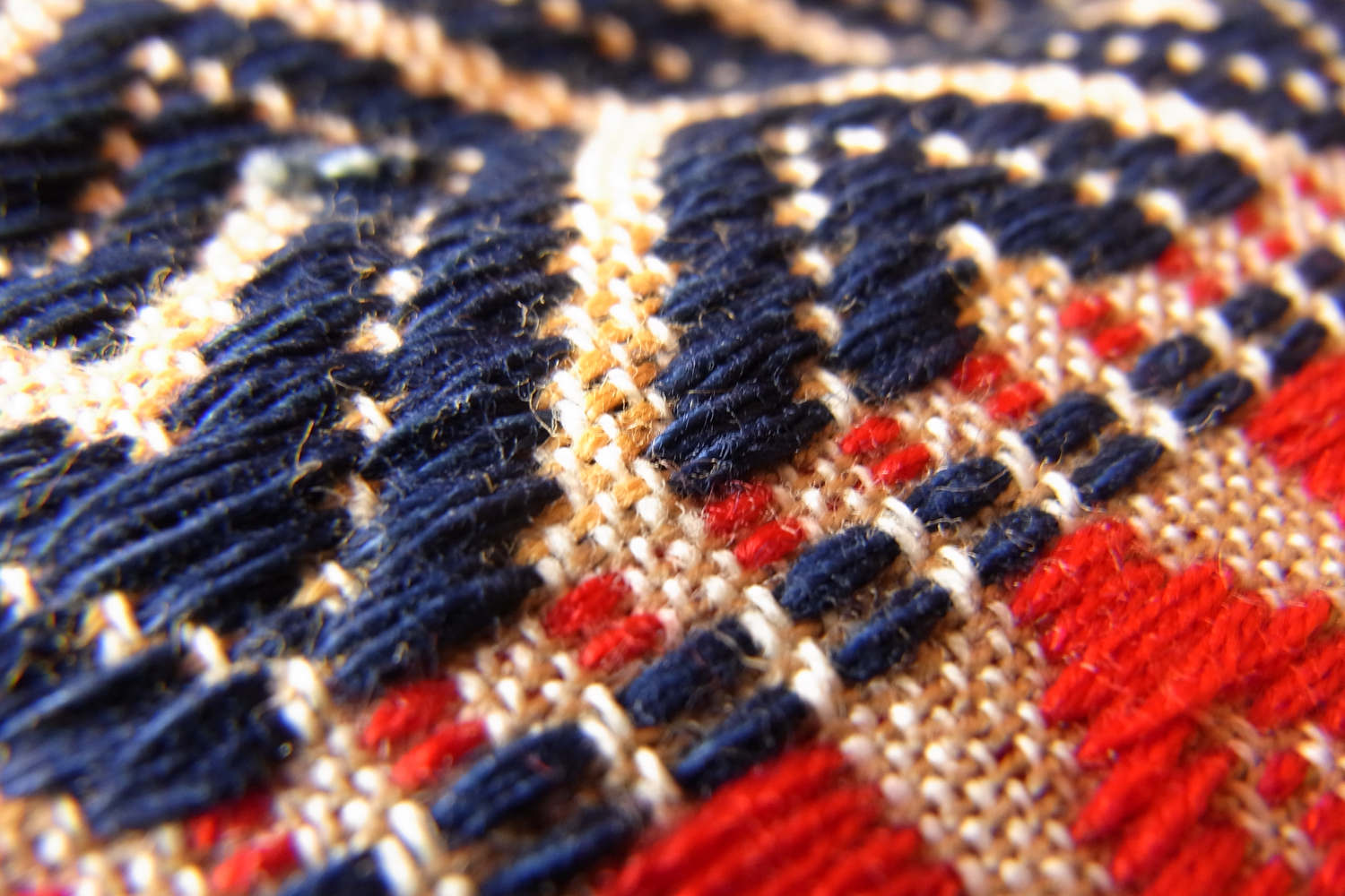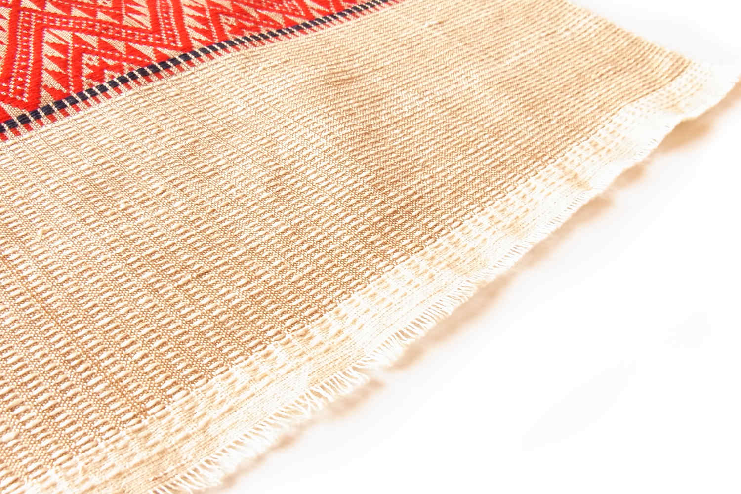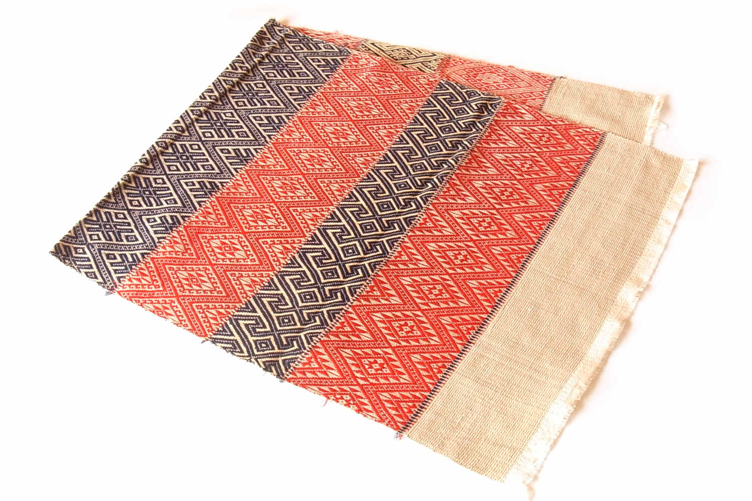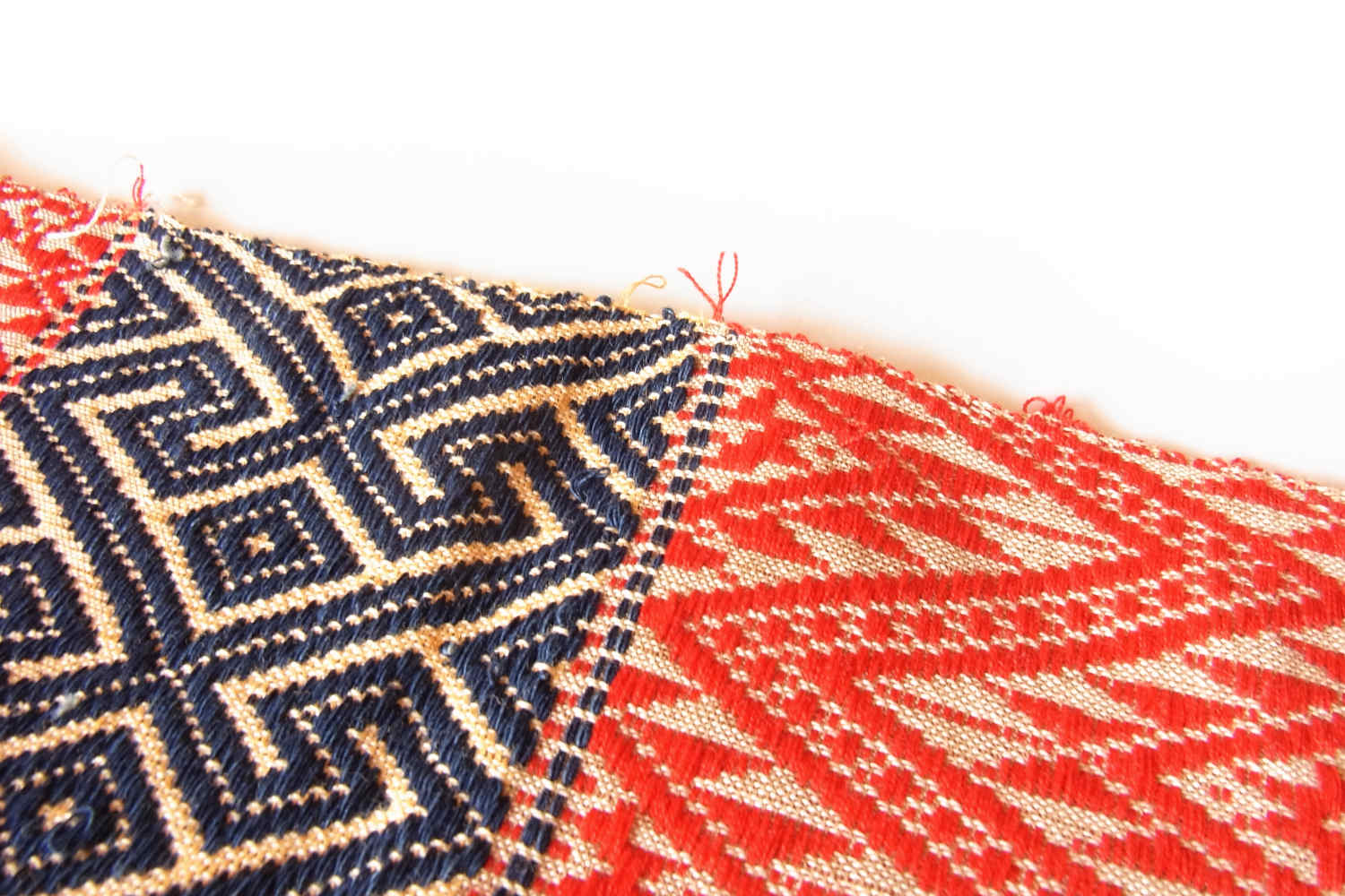 こちらの浮織り布は、ベージュ~淡い黄色の細みの糸を使用し(部分的に緯糸の色合いを変調させて織り上げられております)、赤や藍の天然染料で鉤文や星文などの伝統文様がとても細かに浮織りされております。