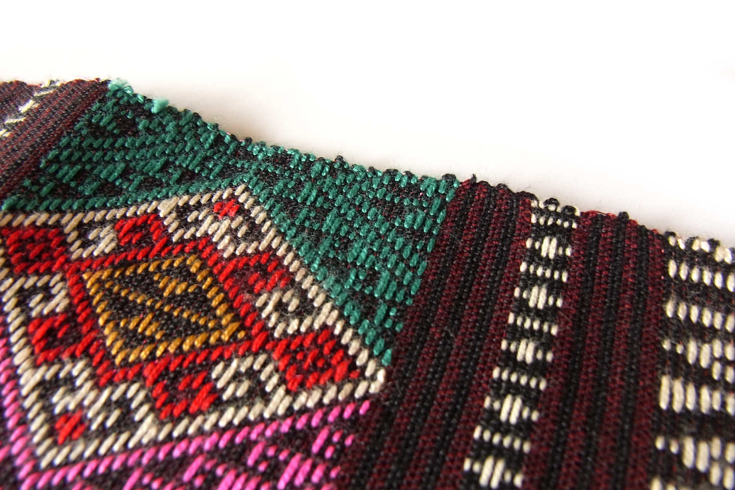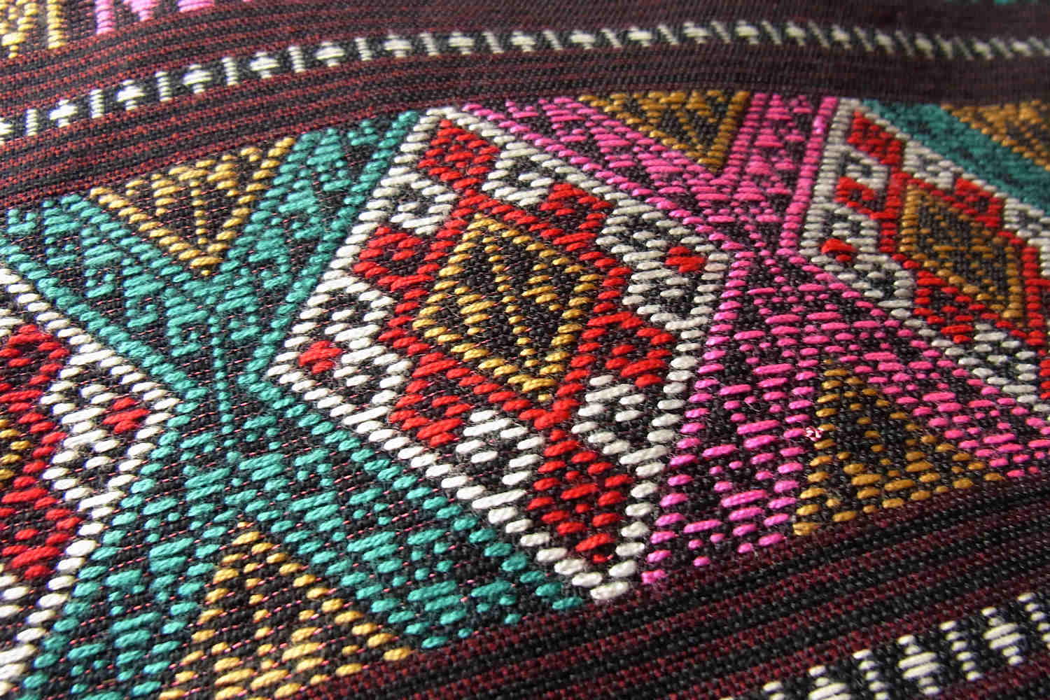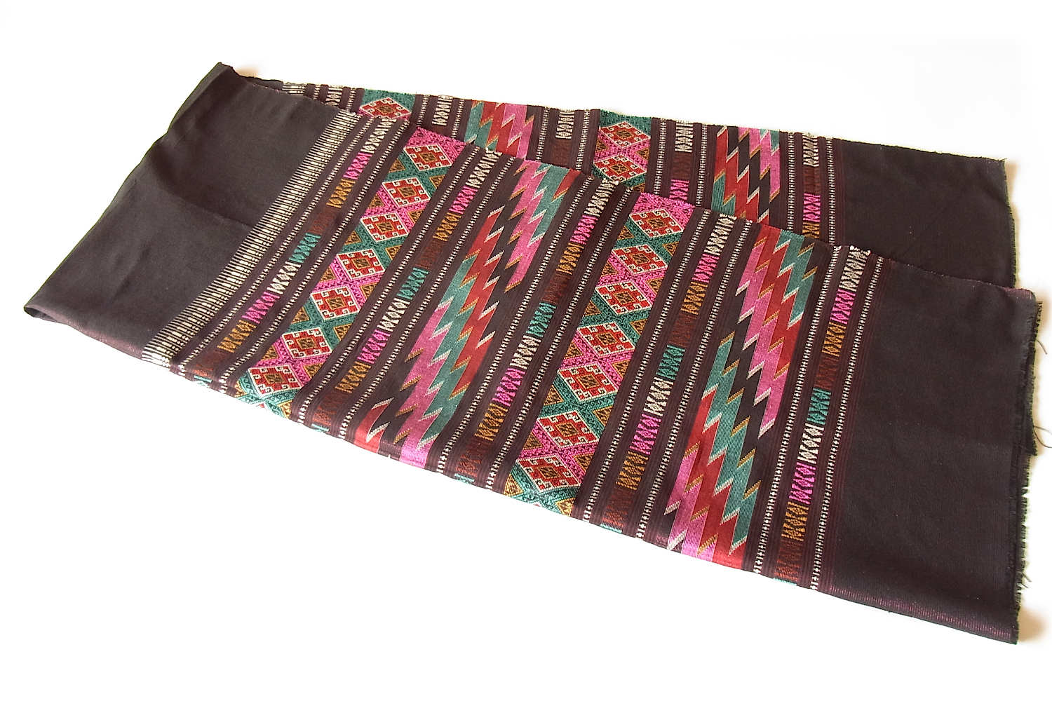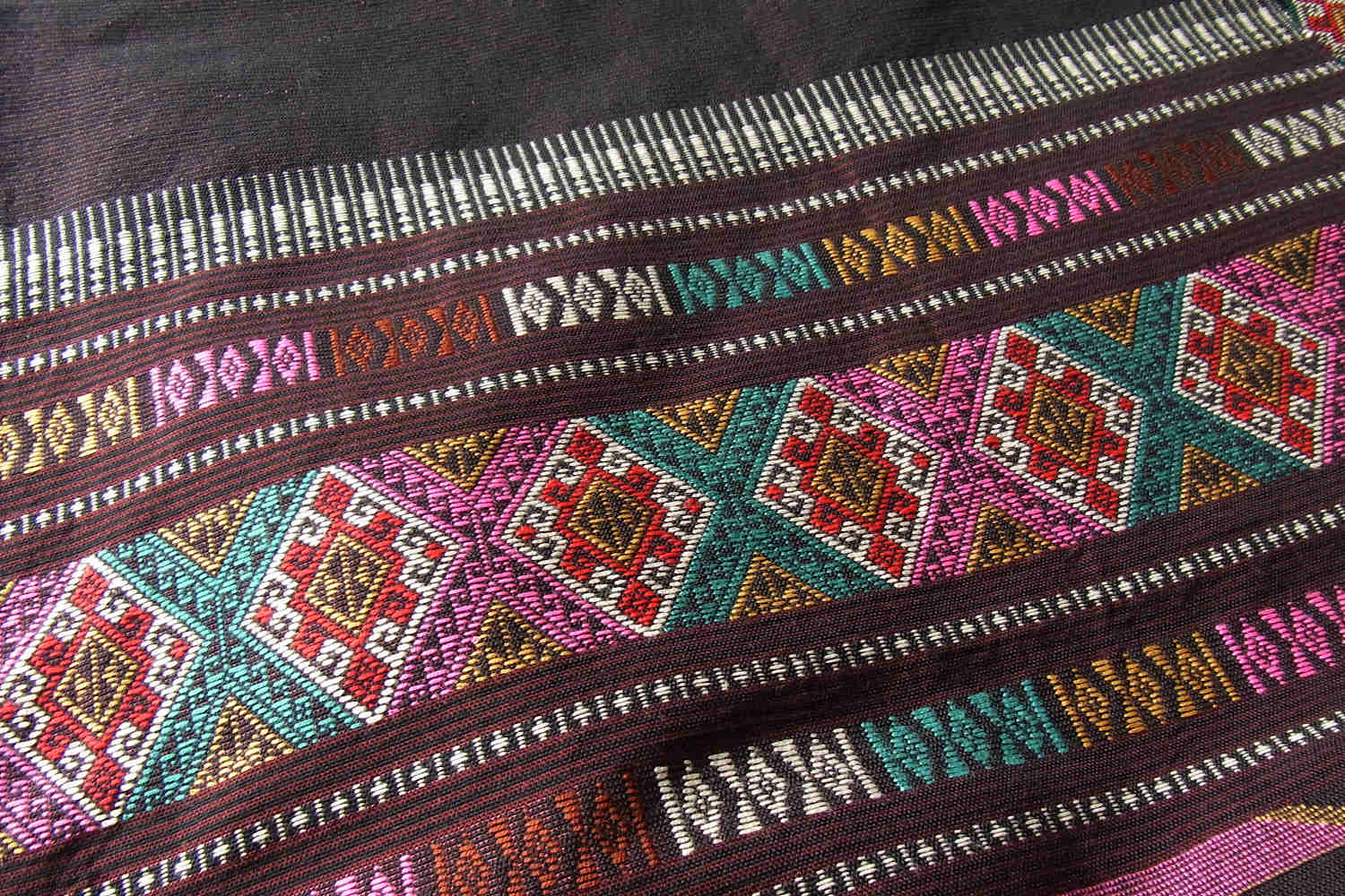 タイのナーン北部の国境に程近いタイ・ルー族が暮らす村でつくられた、華やかな風合いの浮織り布です。