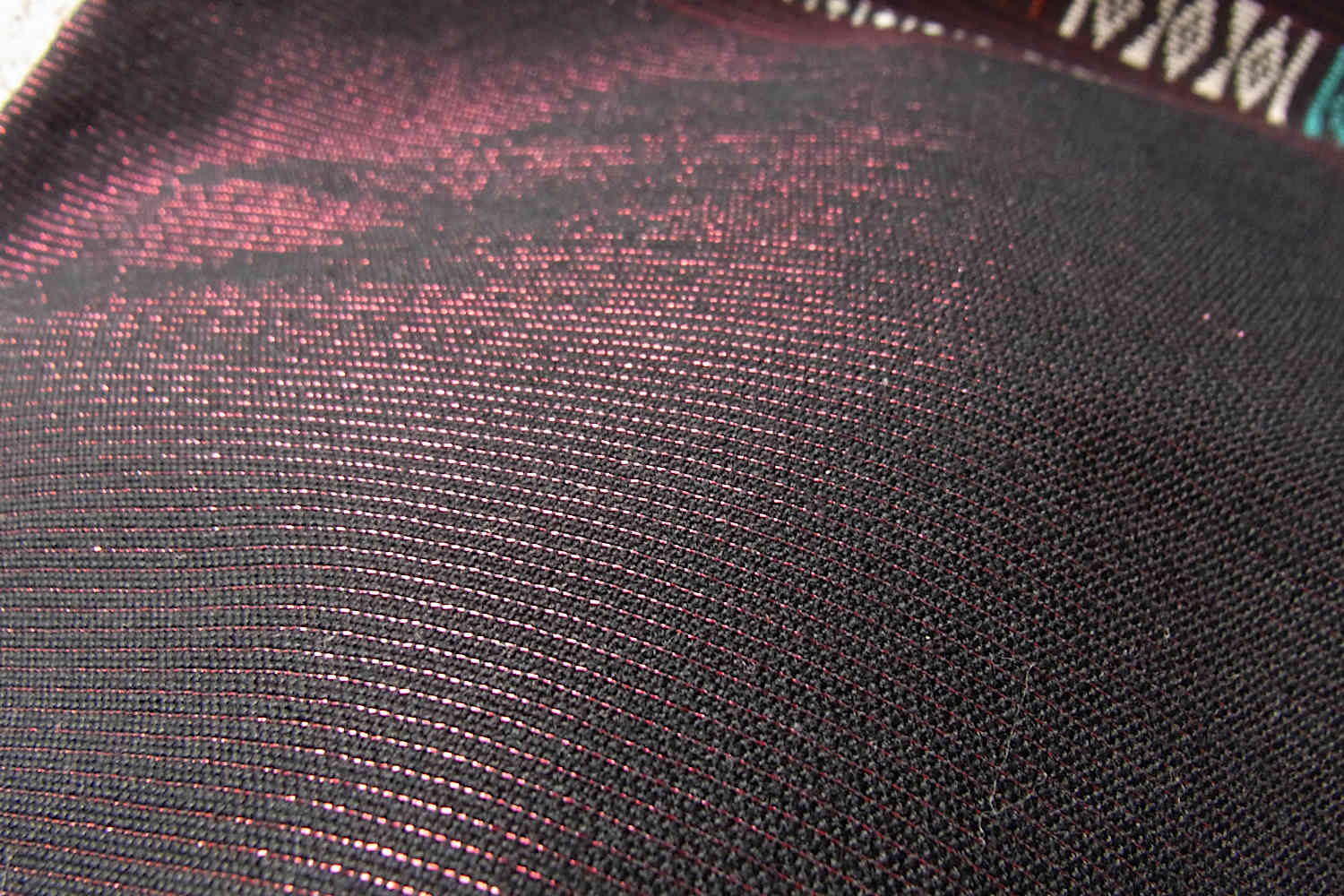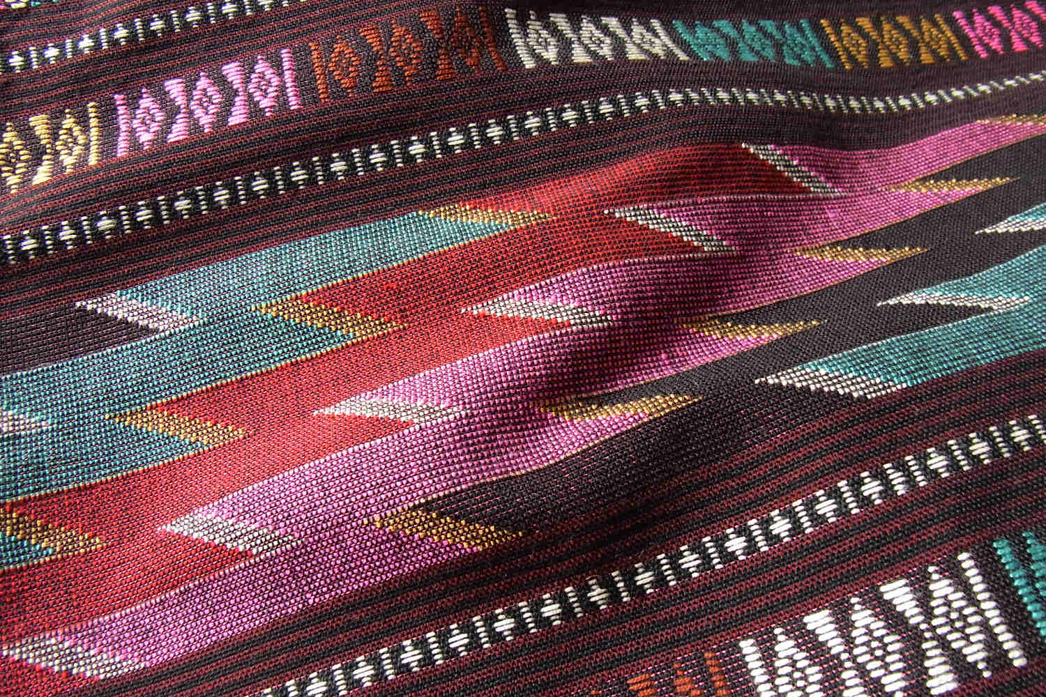 こちらの浮織り布はシン(腰衣)用につくられた織物で、赤のラメ糸と共に織り上げられた黒を基調に、華やかな彩りの浮織りとタイ・ルー族伝統のナームライ模様が綴られております(ラメ糸の様子はサムネイル画像5番を参照下さい)。