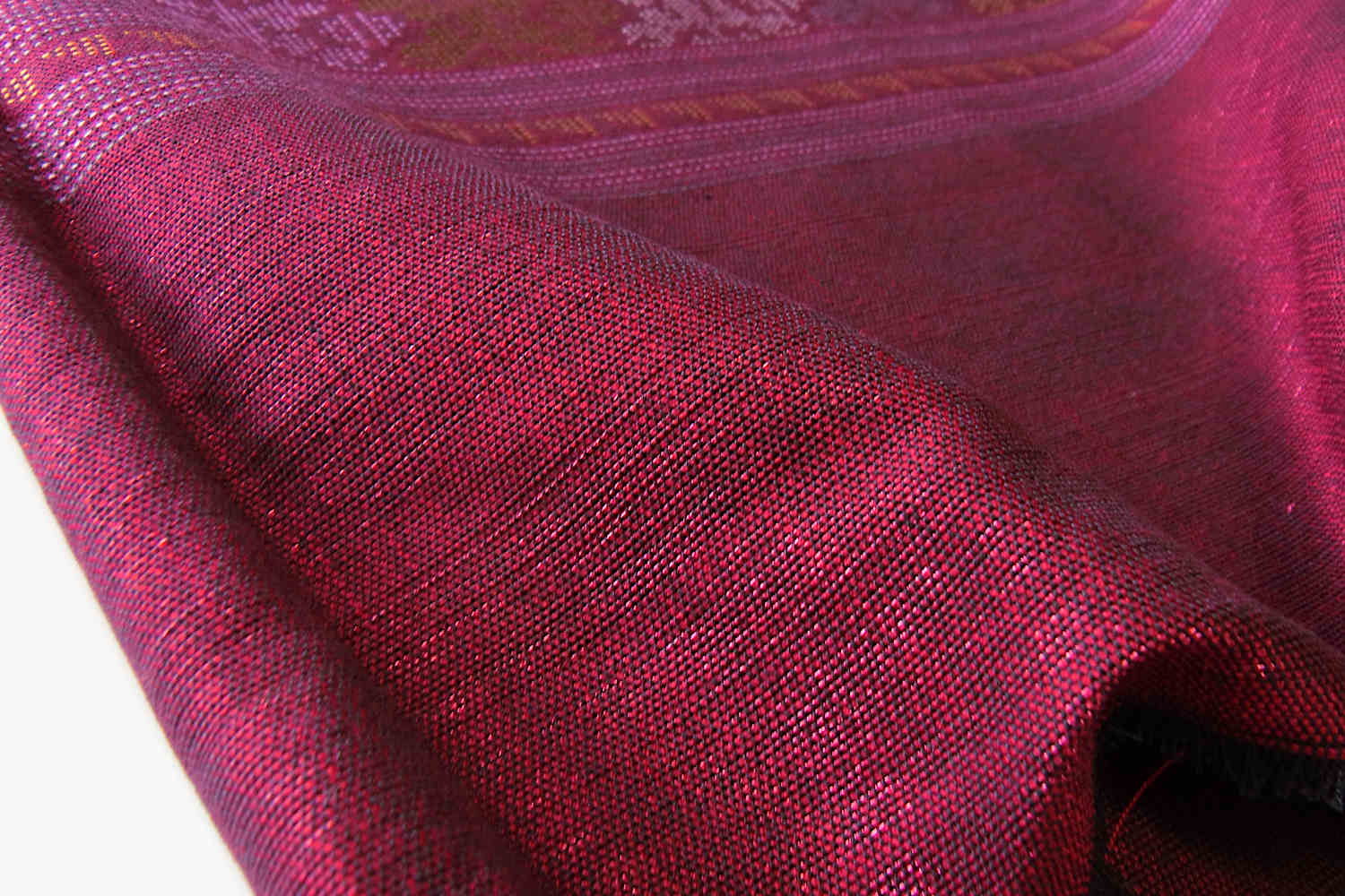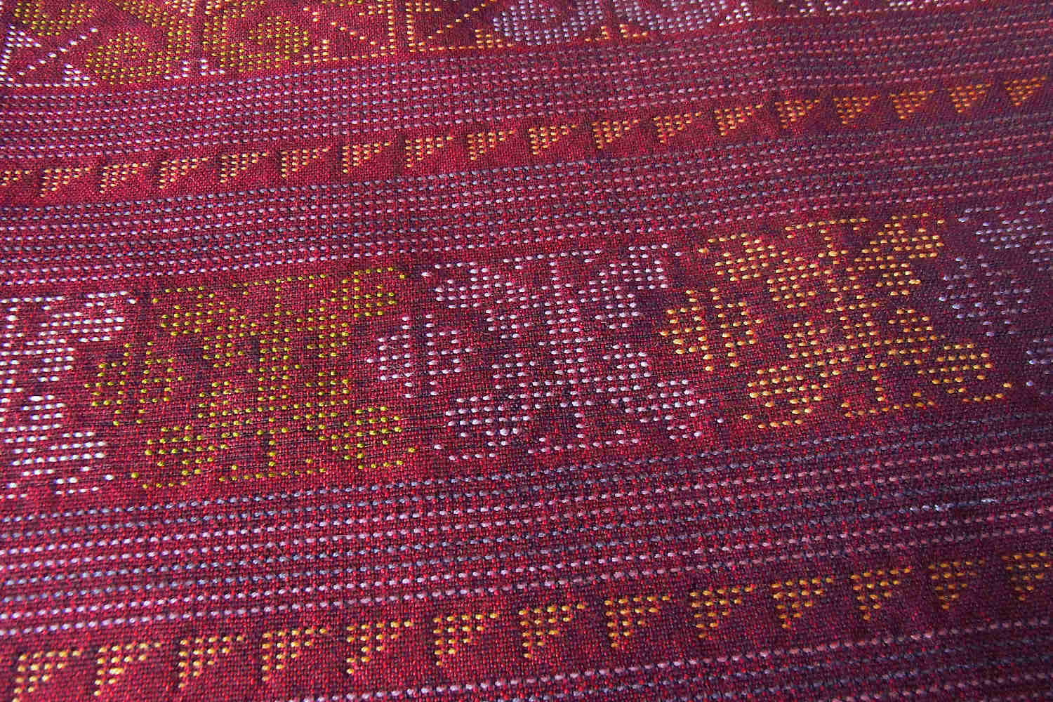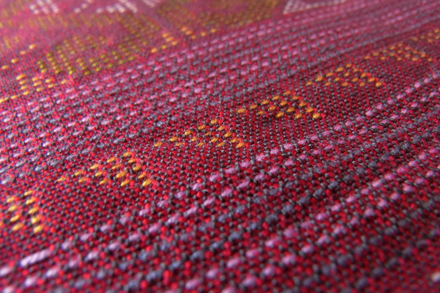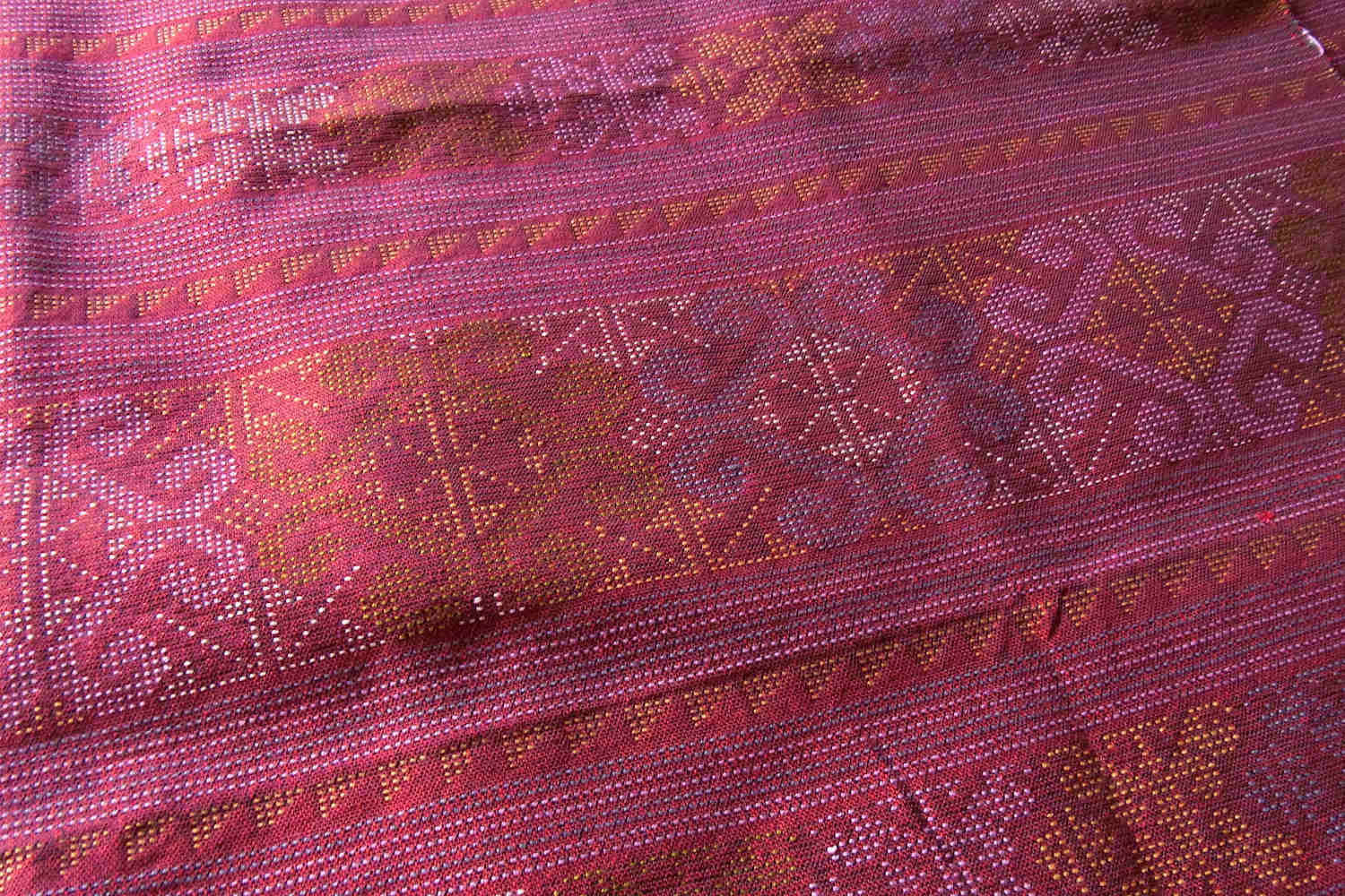 こちらの浮織り布はシン(腰衣)用につくられた織物で、赤のラメ糸と共に織り上げられた深い赤を基調に、華やかな彩りの浮織りが織り込まれた可愛らしさも漂う風合いです(ラメ糸の様子はサムネイル画像5番を参照下さい)。