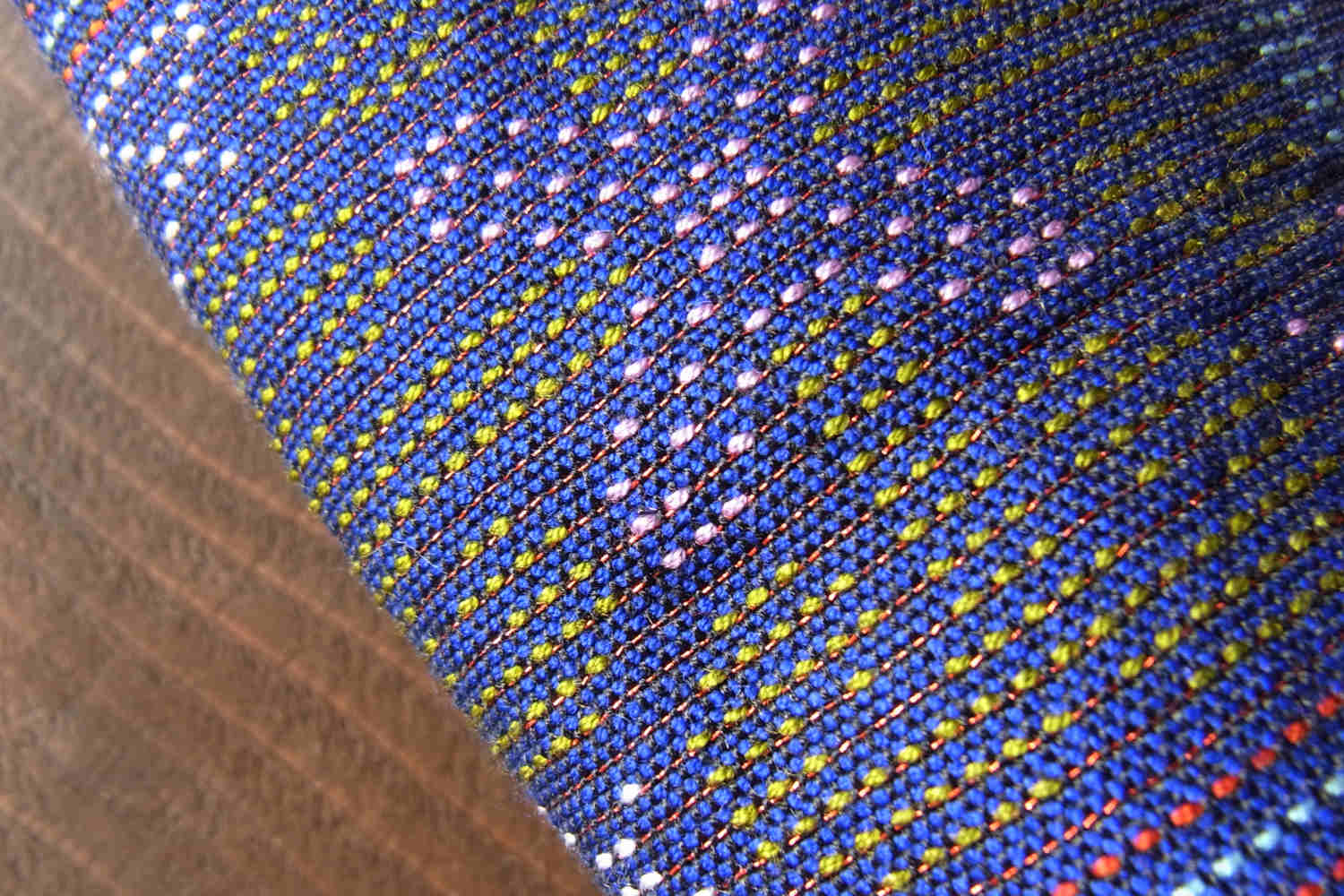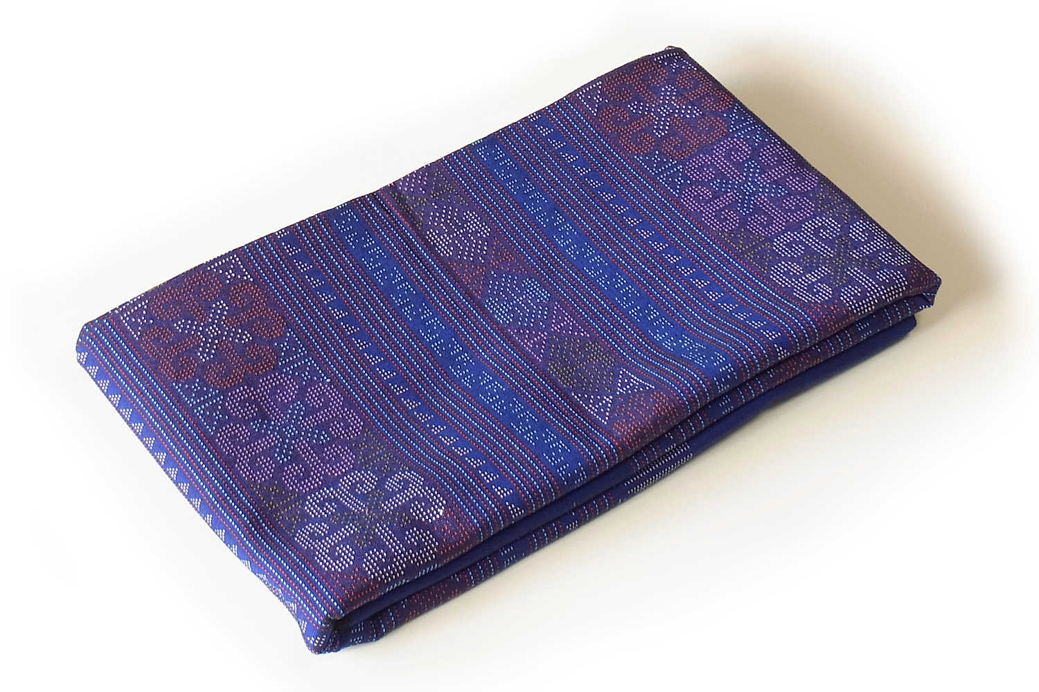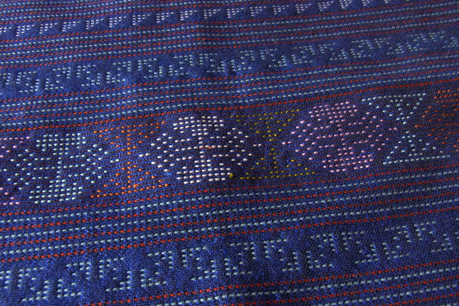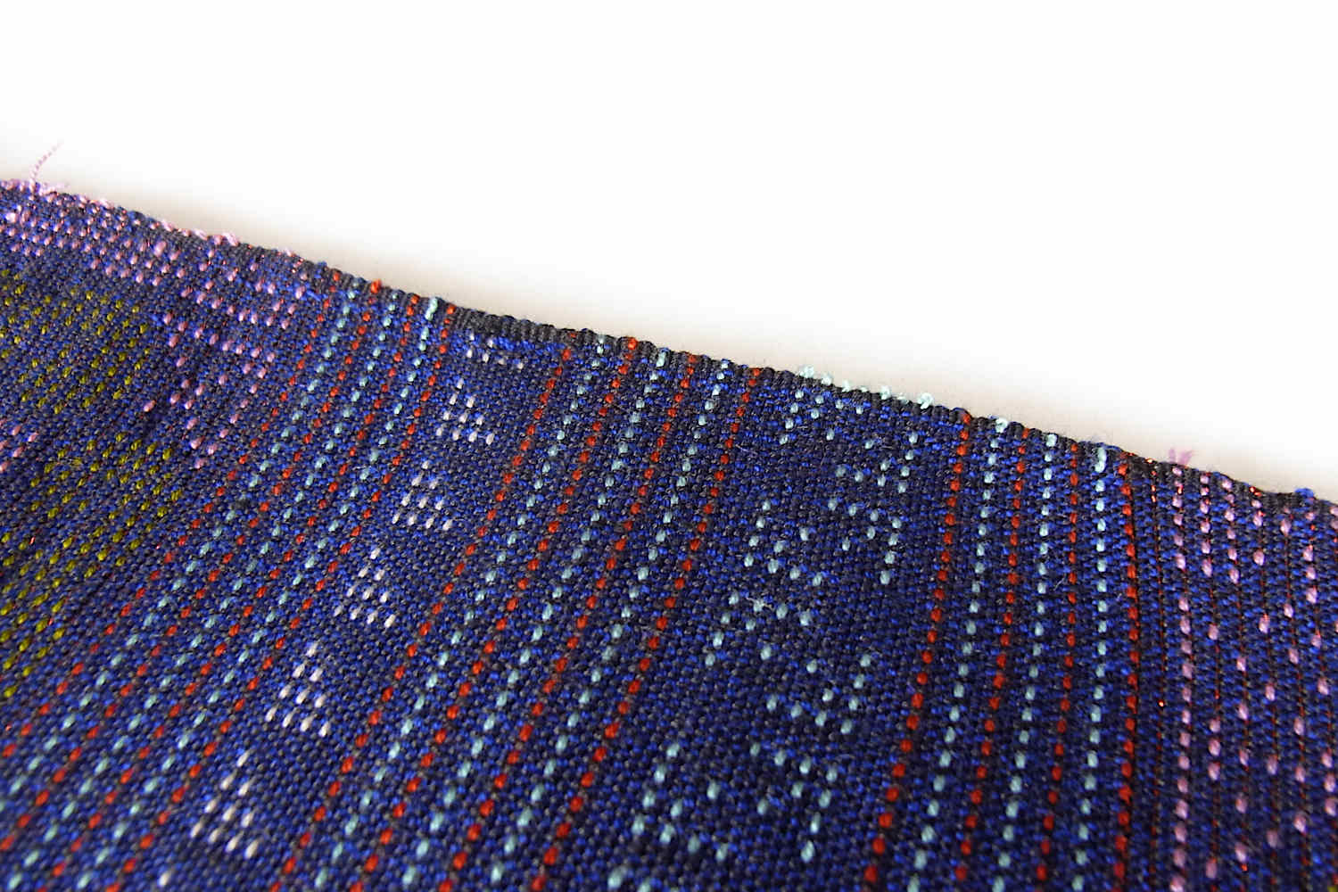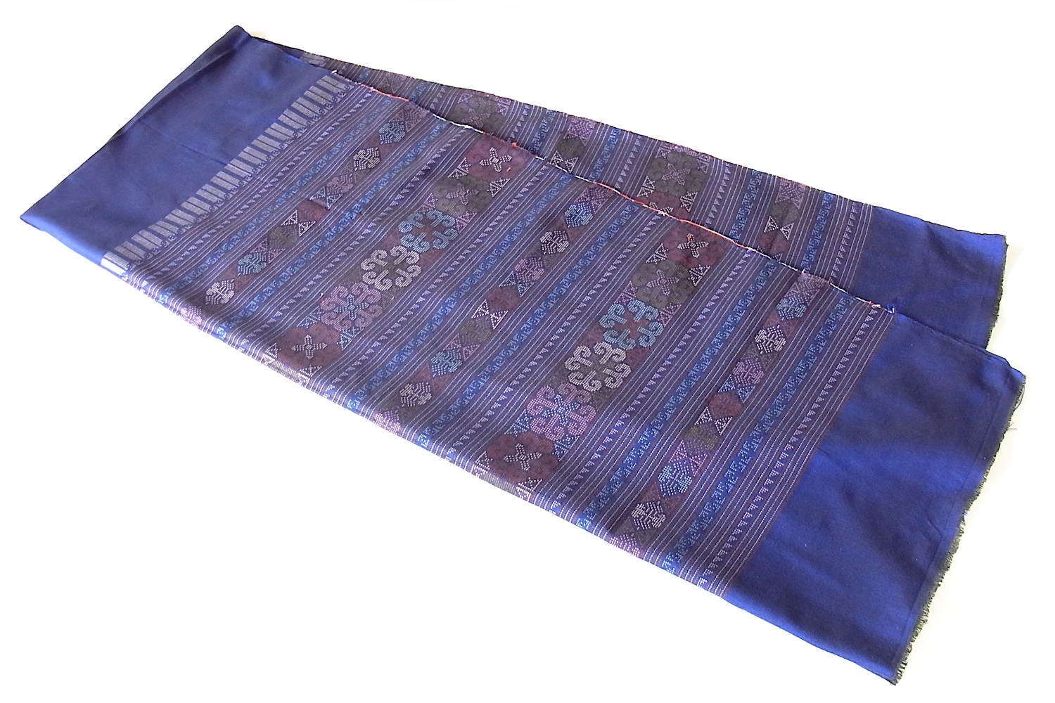 こちらの浮織り布はシン(腰衣)用につくられた織物で、鮮やかな青を基調に幾何学模様部分のベース地は赤のラメ糸と共に織り上げられており、可愛らしさも漂う風合いとなっております(ラメ糸の様子はサムネイル画像4~5番を参照下さい)。