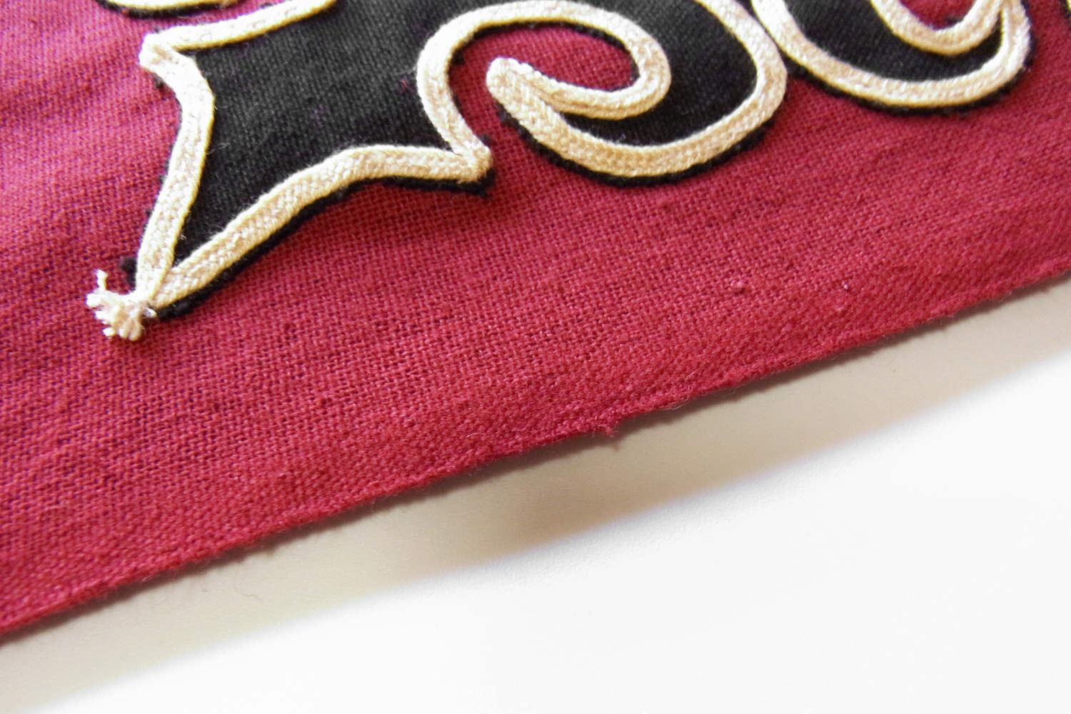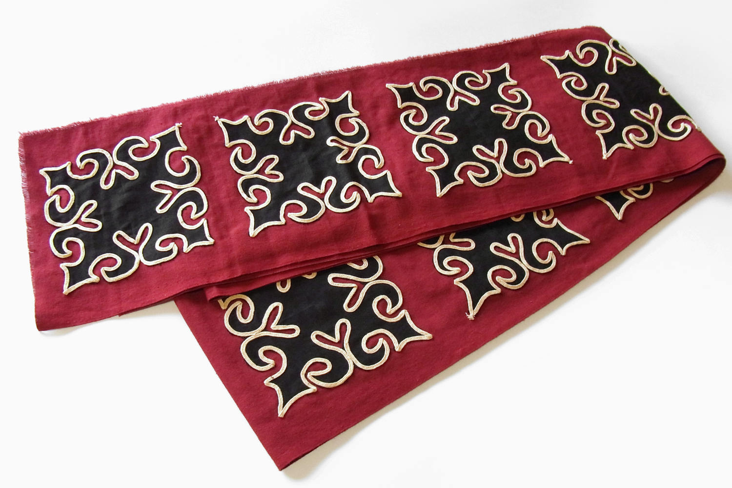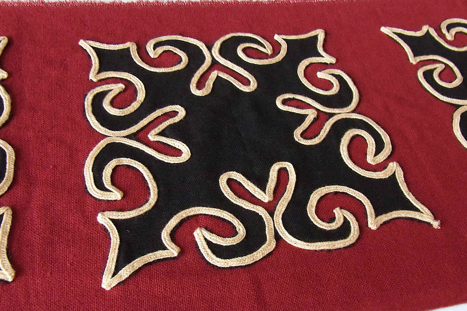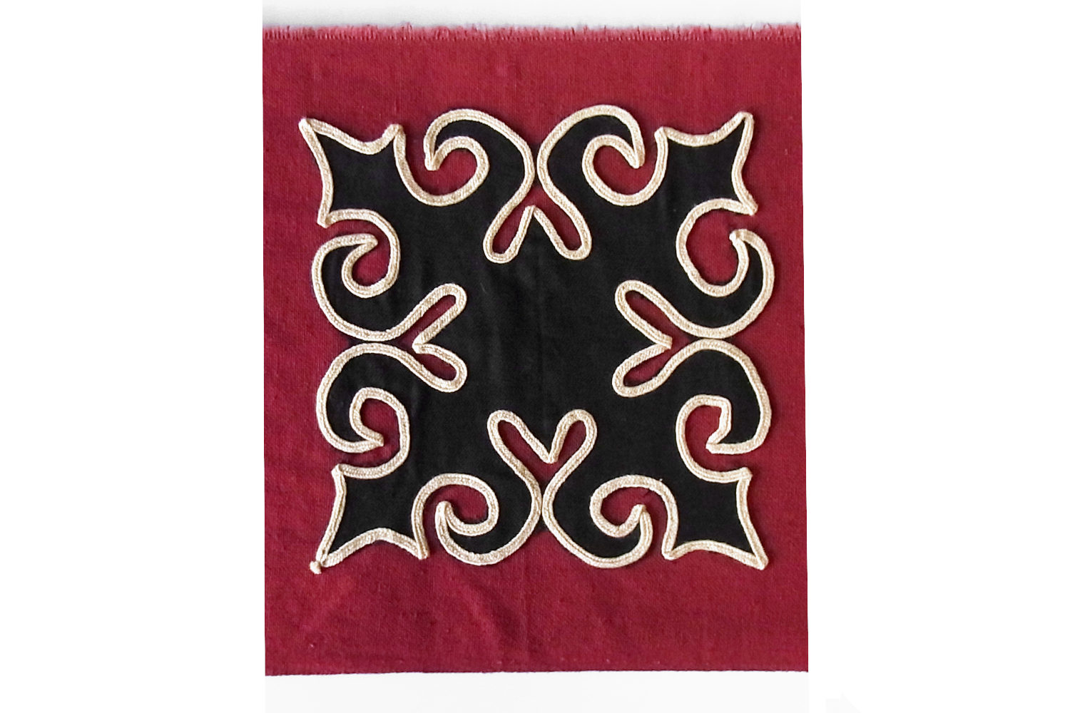 近年は時代と環境に合わせて変化を続けてきた華やかな彩りの刺繍・刺し子・アップリケなどが布雑貨に使用されるなどしております。こちらのアップリケ布は2015年頃につくられた新古品となり、エンジ色をベースに黒布でアップリケが施されベージュの平紐で縁取りがされております(ベースとアップリケのパーツは既製の綿布、縁取り紐はポリエステル製となります)。