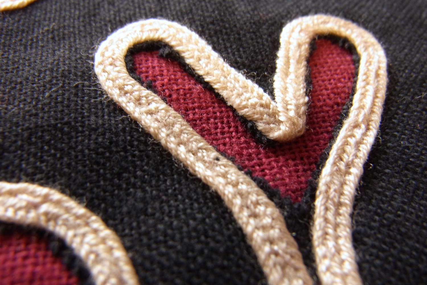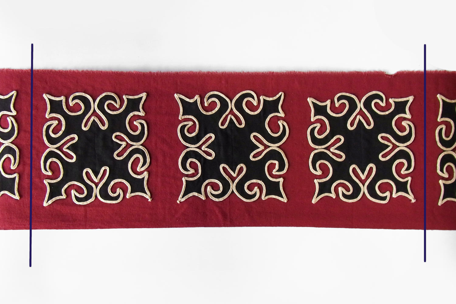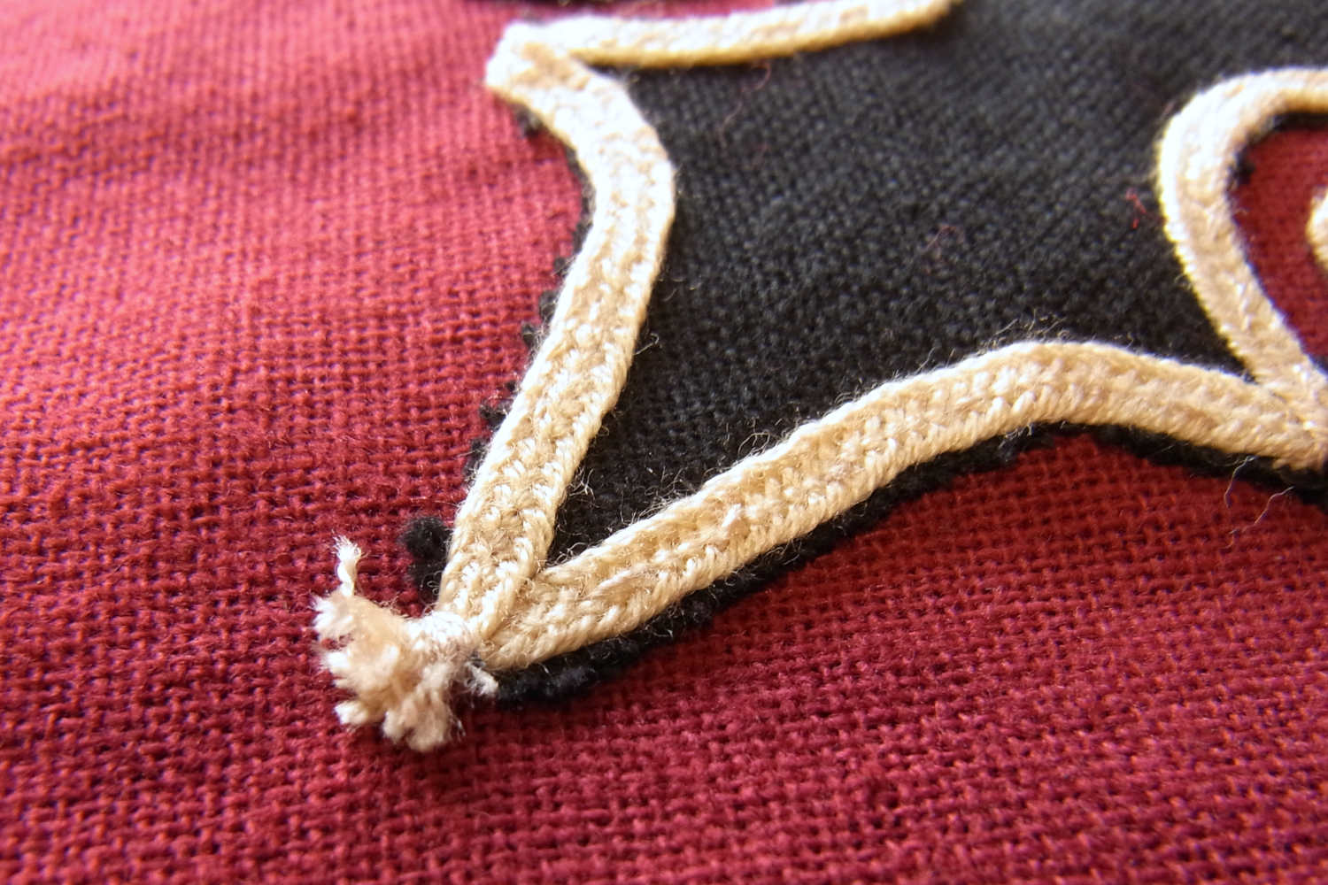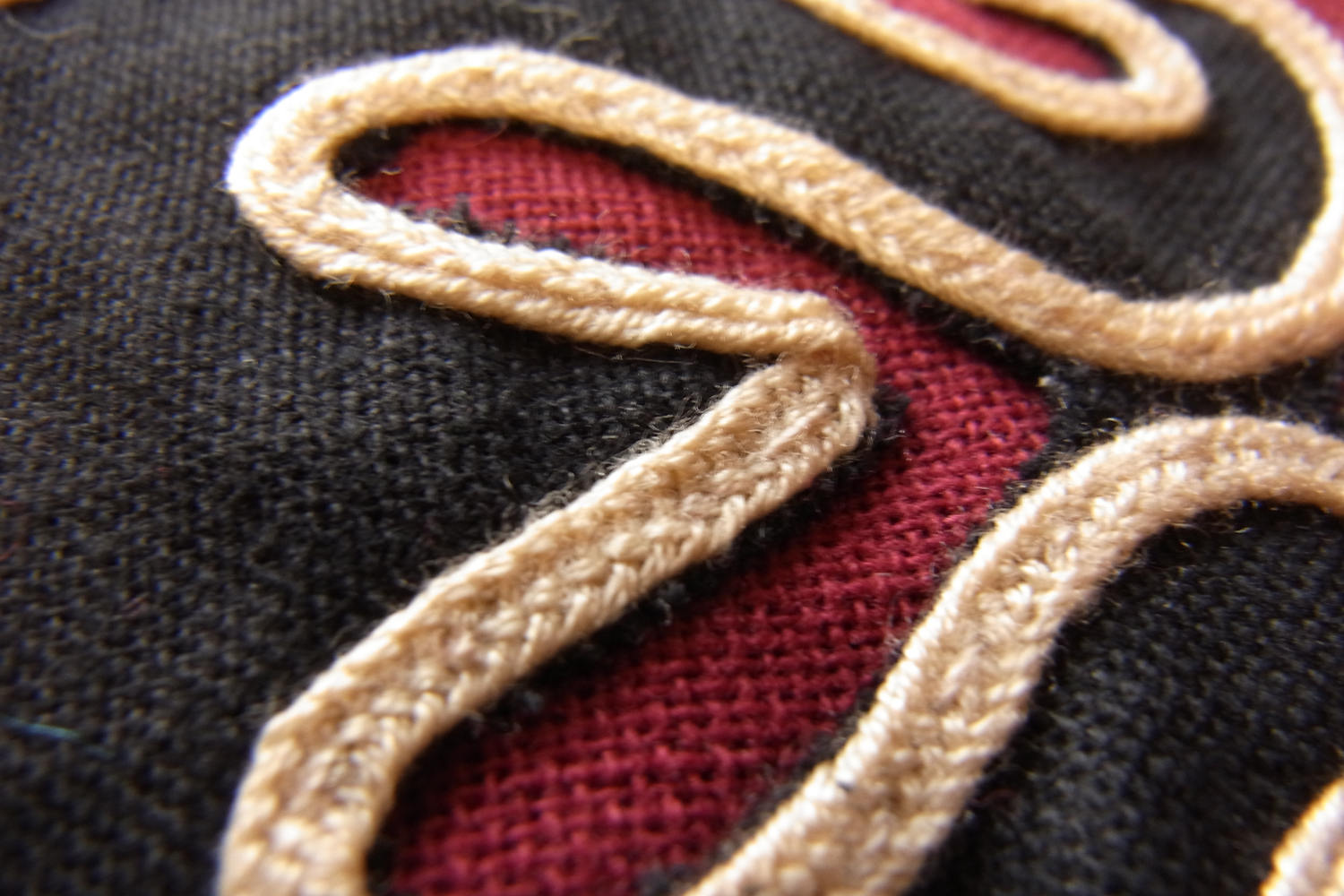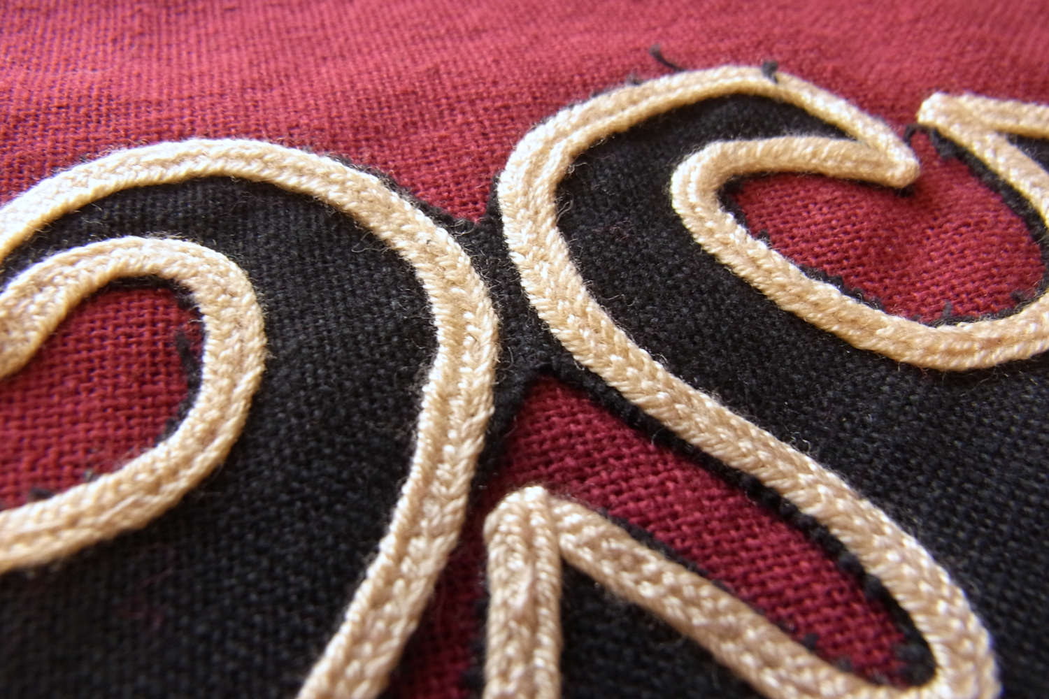 近年は時代と環境に合わせて変化を続けてきた華やかな彩りの刺繍・刺し子・アップリケなどが布雑貨に使用されるなどしております。こちらのアップリケ布は2015年頃につくられた新古品となり、エンジ色をベースに黒布でアップリケが施されベージュの平紐で縁取りがされております(ベースとアップリケのパーツは既製の綿布、縁取り紐はポリエステル製となります)。